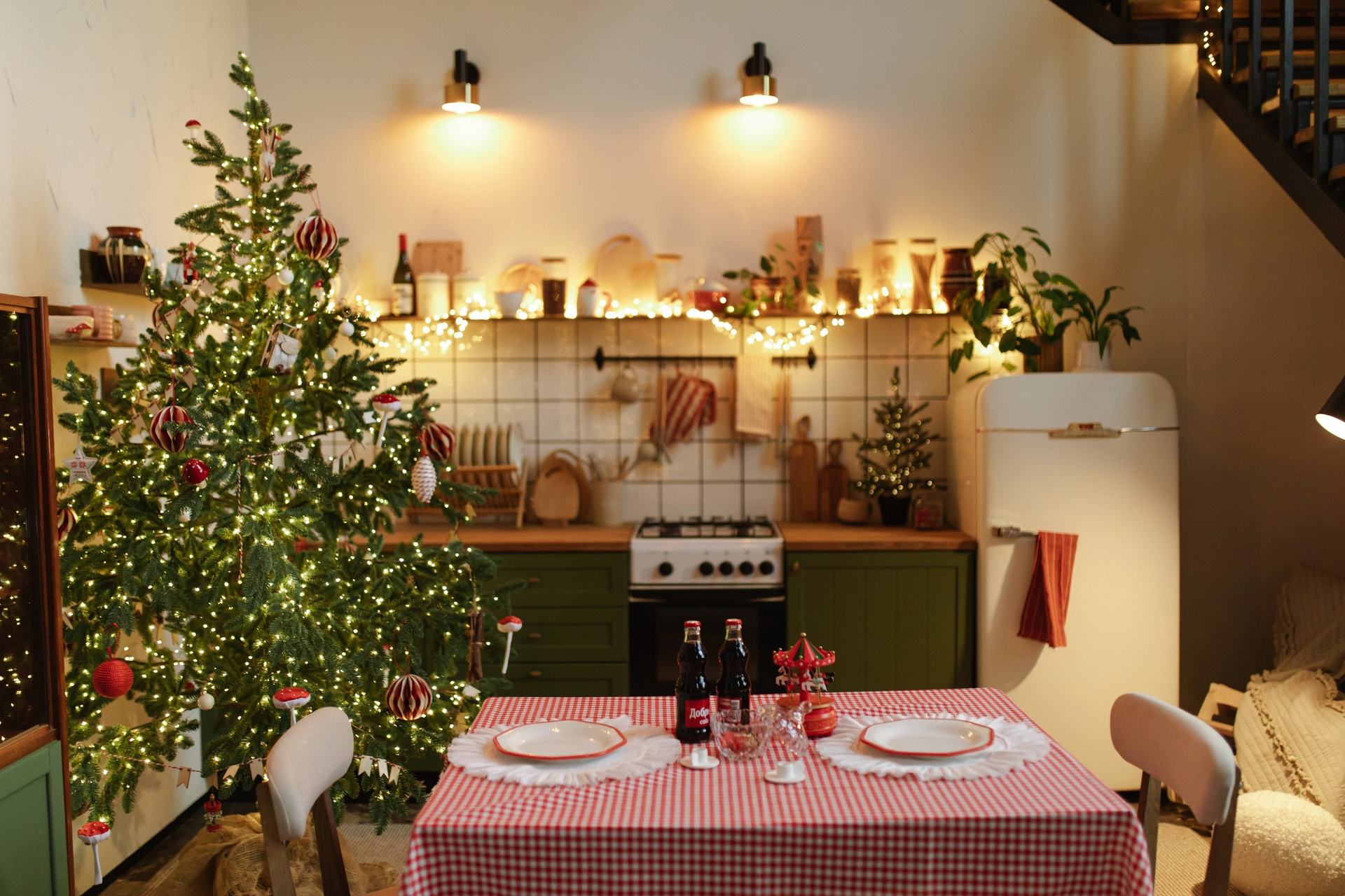 — Теплый свет свечей и украшенная елка, создающие атмосферу уюта.